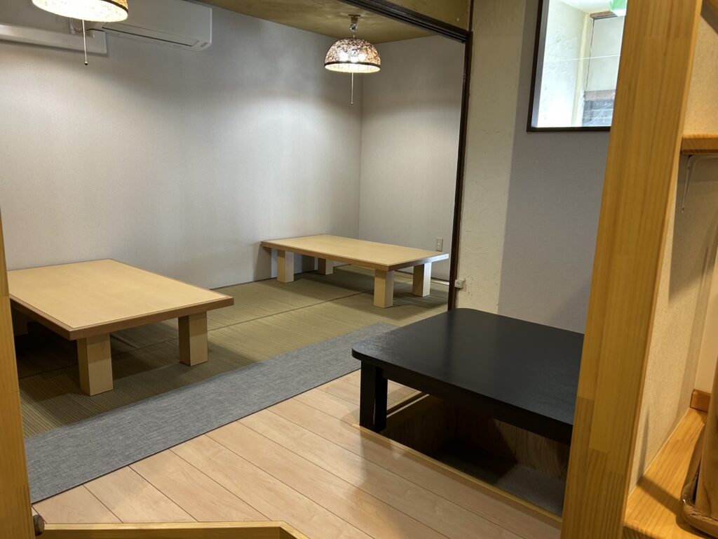 小上がり席を増やしましたが、足の悪いお客様にも利用できるよう、掘りごたつに致しました。
